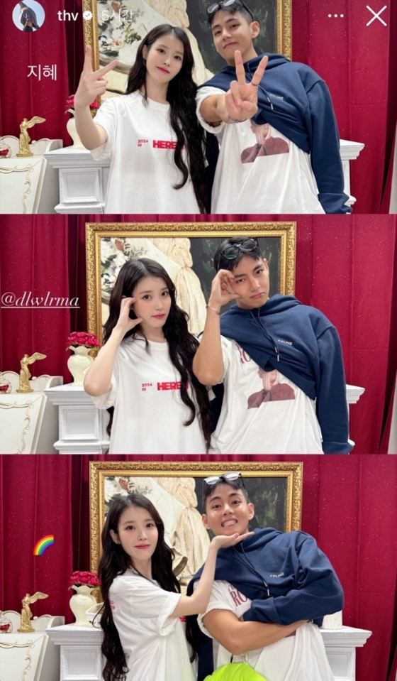 사진 속 뷔는 21일과 22일 서울 마포구 서울월드컵경기장에서 개최된 '2024 IU HEREH WORLD TOUR CONCERT ENCORE : THE WINNING'를 관람한 후 대기실에서 아이유와 만난 모습이었다.