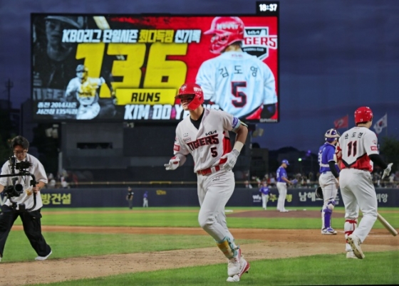 만원관중 앞에서 김도영은 자신의 손으로 KBO 리그 역사를 다시 썼다. 개인 통산 첫 1회 말 선두타자 홈런으로 홈을 밟은 그는 시즌 135득점을 2014년 서건창(당시 넥센)의 134득점을 넘어 KBO 리그 단일시즌 최다 득점 신기록을 경신했다. 5회 초에는 선두타자로 나와 시즌 40호 도루에 성공하며 KBO 리그 국내타자 최초 40-40 대기록 중 도루를 먼저 채웠다. 총 3타수 3안타(1홈런) 1타점 3득점 1도루로 타율도 0.344에서 0.345로 높였다.