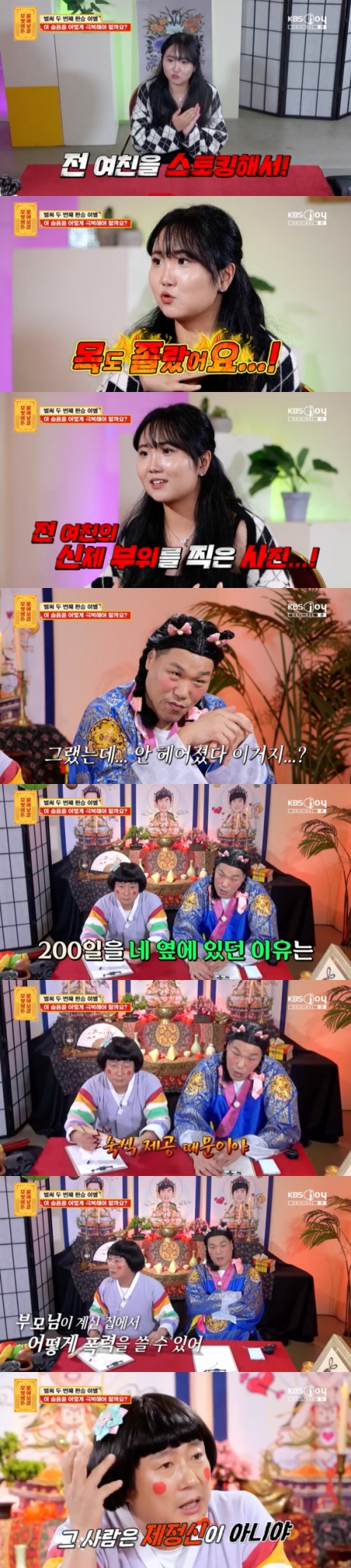 이날 21세 사연자는 "전 남자친구와 교제한 지 한 달도 안 돼서 동거를 했는데, 이유가 있다"며 "(전 남자친구가) 나랑 만나기 전에 사귀었던 전 여자친구를 스토킹해서 재판 중이었다. 그래서 내가 우리 부모님한테 말해서 우리집에서 함께 산 것"이라고 밝혔다.