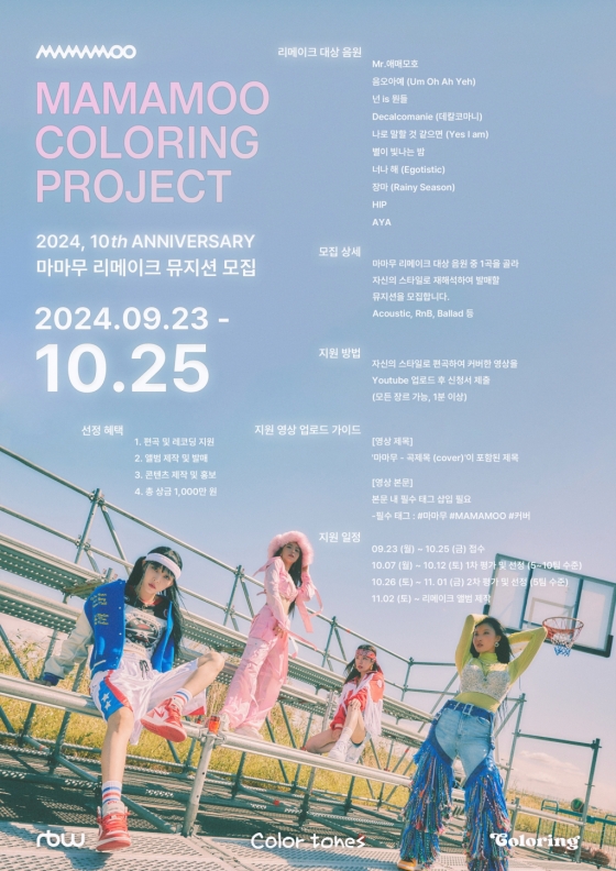 컬러톤즈는 9월 23일부터 10월 25일까지 마마무 대표곡 리메이크 프로젝트 'MAMAMOO COLORING PROJECT'에 참여할 뮤지션을 모집한다. 이번 프로젝트는 알비더블유(RBW)가 공동으로 주최하며, 마마무의 대표곡을 재해석한 리메이크 앨범 제작을 지원한다.
