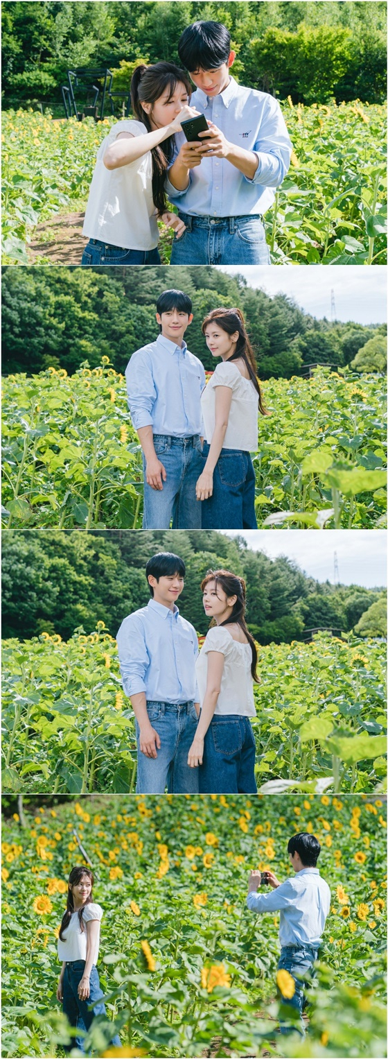 그런 가운데 공개된 사진 속 최승효, 배석류가 달콤한 첫 입맞춤을 나눈 해바라기 꽃밭 사이 본체들의 대기 시간 모습이 이목을 집중시킨다. 마치 그림 같은 풍경을 배경으로 다정한 인증샷을 남기는 두 배우의 청량하고 달달한 비주얼 케미스트리가 감탄을 자아낸다. '워너비' 남사친, 여사친 면모의 편안하고 자연스러운 분위기부터 정소민을 바라보는 정해인의 부드러운 눈길과 따뜻한 미소까지. 회를 거듭할수록 핑크빛 로맨스를 가속화하며 심박수를 상승시킨 정해인, 정소민의 로코 시너지를 다시 한번 확인시킨다.