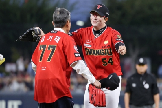 KIA 이범호 감독(왼쪽)이 25일 광주 삼성전에서 시구를 하고 내려온 김기태 전 감독을 맞이했다. /사진=KIA 타이거즈 제공