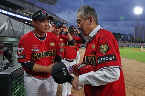 KIA 이범호 감독(왼쪽)이 25일 광주 삼성전에서 양현종을 축하하고 있다. /사진=KIA 타이거즈 제공