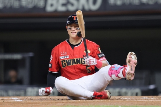 KIA 김도영이 25일 광주 삼성전에서 방망이를 헛돌리고 엉덩방아를 찧었다. /사진=KIA 타이거즈 제공