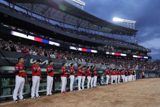 KIA 선수단이 25일 광주 삼성전에 앞서 국민의례를 하고 있다. /사진=KIA 타이거즈 제공
