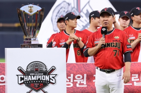 KIA 이범호 감독이 25일 광주 삼성전에서 정규시즌 우승에 대한 감사인사를 했다. /사진=KIA 타이거즈 제공