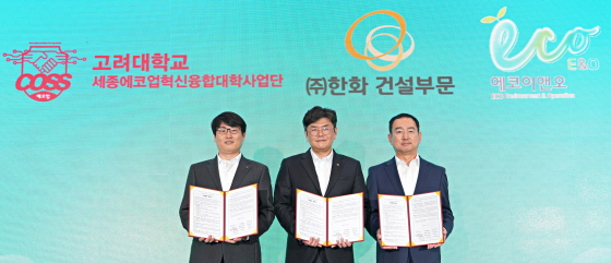 이날 협약식에는 ㈜한화 건설부문 이준명 인프라사업본부장, 고려대학교 세종에코업혁신융합대학사업단 김영진 부단장, 에코이앤오㈜ 조용주 본부장 등 협약기관 임직원이 참석했다.