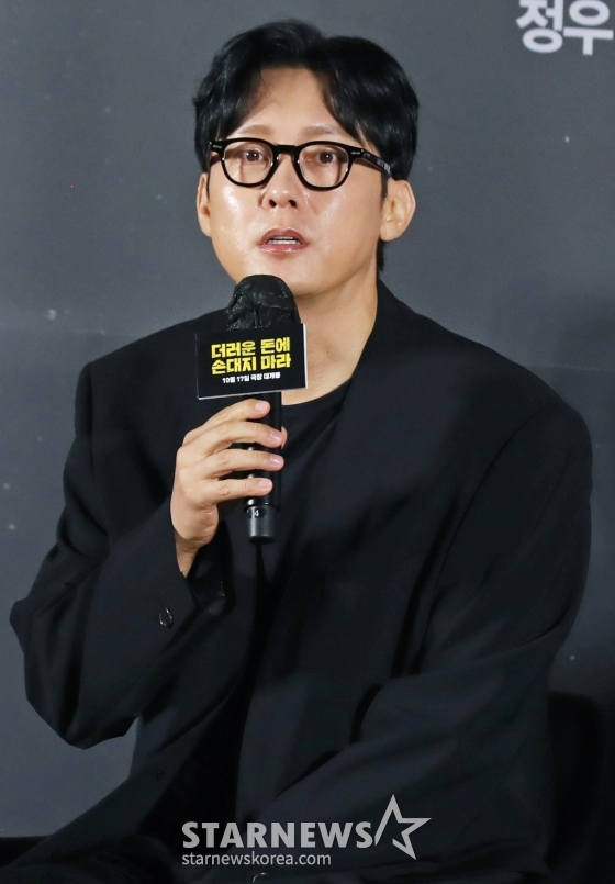 배우 박병은이 26일 오전 서울 CGV용산아이파크몰에서 진행된 영화 '더러운 돈에 손대지 마라'(감독 김민수) 제작발표회에 참석해 질문에 답하고 있다.