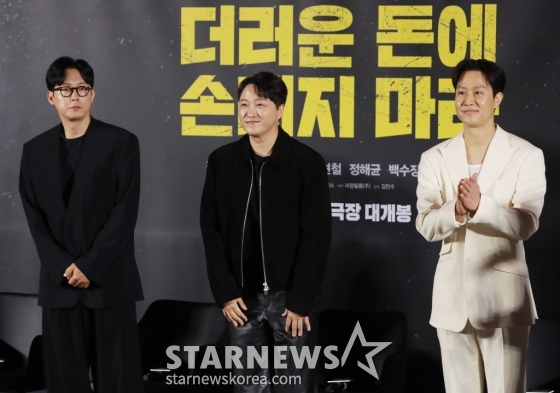 26일 오전 서울 용산구 CGV용산아이파크몰에서 영화 '더러운 돈에 손대지 마라'(감독 김민수) 제작보고회가 열렸다. 이날 행사에는 배우 정우, 김대명, 박병은 배우, 김민수 감독이 참석했다.