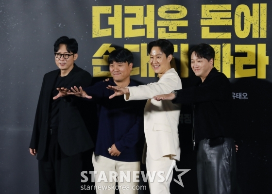 배우 박병운, 김민수 감독, 배우 정우, 김대명이 26일 오전 서울 CGV용산아이파크몰에서 진행된 영화 '더러운 돈에 손대지 마라'(감독 김민수) 제작발표회에 참석해 포즈를 취하고 있다.