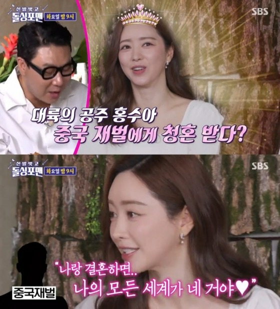 특히 홍수아는 지난 4일 '신발벗고 돌싱포맨'에 출연해 중국 재벌에게 프러포즈 받은 적이 있다며 "'너 나랑 결혼하면 나의 모든 세계는 네 거야'라고 말했다"고 밝혀 화제를 모았다.