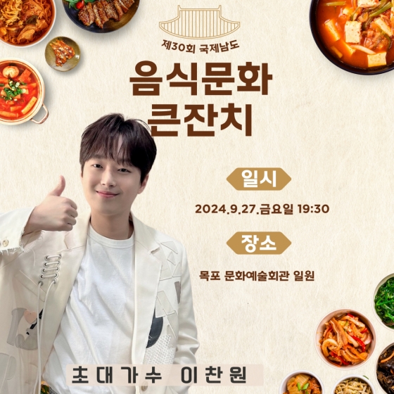 이찬원은 9월 27일 오후 7시 30분 전남 목포시 남농로 목포문화예술회관 일원에서 열리는 '2024 국제남도음식문화 큰잔치' 개막식 공연에 출연한다.