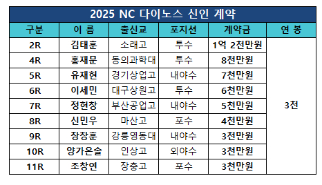 NC는 26일 "2025 KBO리그 신인 드래프트에서 뽑은 9명의 신인선수 및 2명의 육성 선수와 입단 계약을 마쳤다"고 밝혔다.
