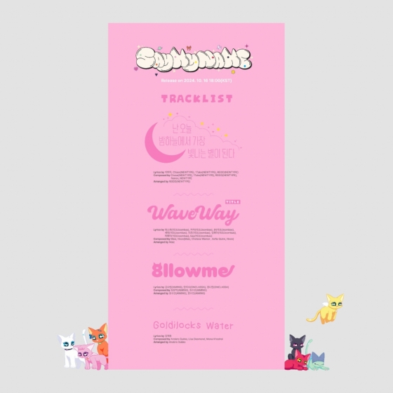 또한 트랙리스트 이미지는 핑크빛 컬러감과 트레일러 영상 속에 등장했던 일곱 마리 고양이의 조합으로 러블리한 느낌을 자아냈고, 각기 다른 폰트로 꾸며진 곡 제목은 다양한 스타일의 곡 분위기를 기대하게 만들었다.