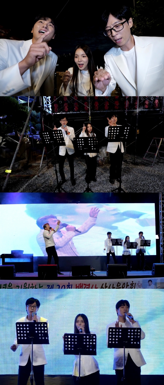공개된 사진 속에는 '트로트계 대부'이자 '유산슬의 스승' 진성과 함께 산사음악회 행사 무대에 선 유재석, 박진주, 이이경의 모습이 담겨 있어 눈길을 끈다. 해당 모습은 SNS 상에도 "놀뭐 멤버들이 여기 왜 나와?"라는 목격담 영상이 올라왔고, 이들의 코러스 도전에 관심을 집중시켰다.