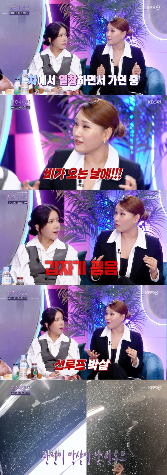 이에 출연진들은 "두성으로 선루프를 깬 거냐", "만화처럼 사자후를 날렸냐"라며 믿지 못한 모습을 보였고, 손승연은 실제로 산산조각으로 박살 난 선루프 사진을 인증해 모두의 시선을 끌었다.