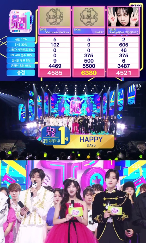 29일 오후 방송된 SBS 가요프로그램 '인기가요'에서는 9월 마지막 주 1위 후보로 데이식스의 '웰컴 투 더 쇼(Welcome to the Show)'와 해피(HAPPY), 이영지의 '스몰 걸(Small Girl)'이 이름을 올렸다.