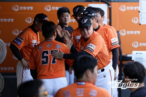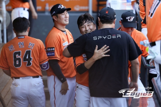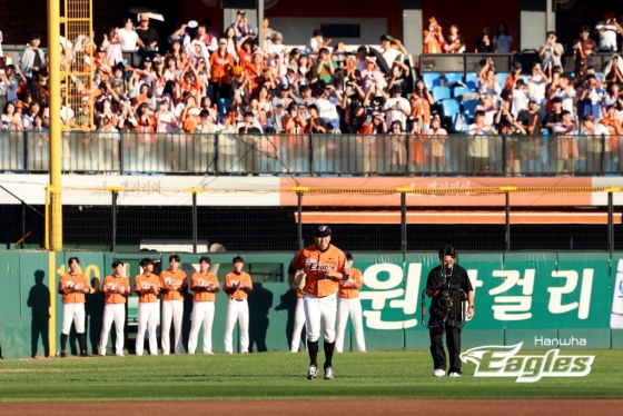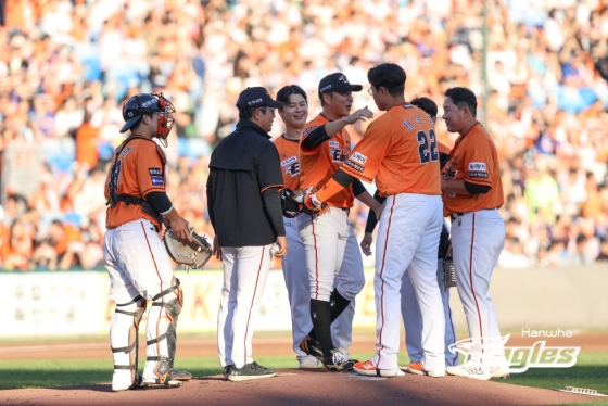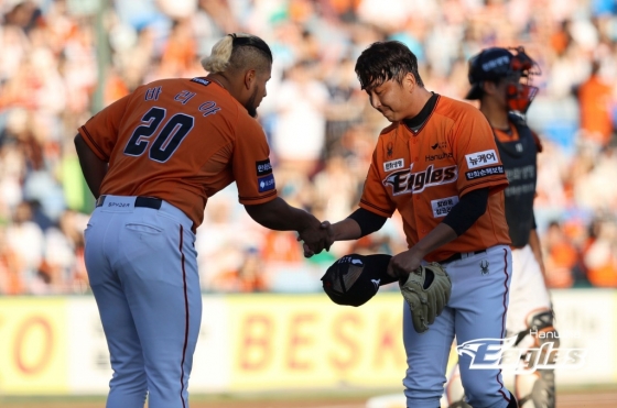 정우람의 투구는 여기까지였다. 이미 경기 전부터 한 타자만 상대하기로 했던 정우람이었다. 먼저 포수 최재훈과 무언가 이야기를 나눈 정우람. 더그아웃에서 양상문 투수 코치가 마운드로 올라왔다. 잠시 정우람이 외야를 바라보며 서 있었다. 정우람은 1루수 채은성, 2루수 안치홍, 유격수 이도윤, 3루수 노시환과 일일이 포옹을 나눴다. 모두 모자를 벗은 채였다.