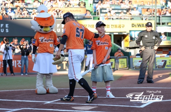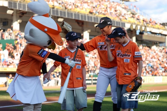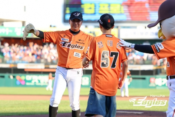 플레이볼에 앞서 정우람이 포수 자리로 향했다. 정우람이 배터 박스에 서 있는 작은 아들 정민후 군의 볼을 어루만졌다. 포수 자리에 앉은 정우람. 이어 시구자로 나선 큰아들 정대한 군이 힘차게 공을 던졌다. 공은 한 번에 정우람의 글러브 안으로 쏙 들어왔다. 정우람 특유의 투구 모습이 정대한 군의 투구 동작에서도 보이는 듯했다. 정우람이 그런 큰아들을 향해 엄지를 치켜세우며 환하게 웃었다.