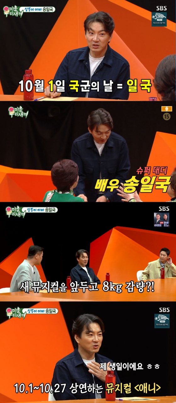 이날 송일국은 새 뮤지컬을 앞두고 8kg를 감량했다고 이야기했다. 작품 소개를 요청하는 질문에는 "뮤지컬 '애니'라는 작품이다. (제 생일날(10월 1일)에 첫 공연을 한다"라고 밝혔다.