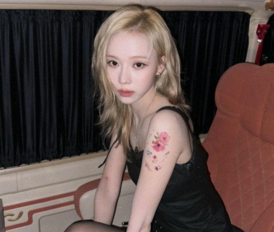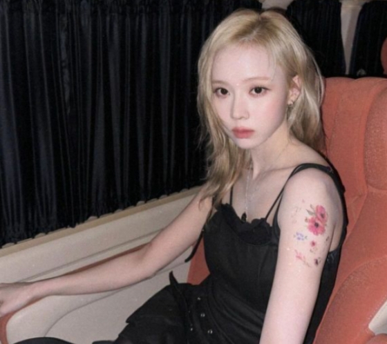 공개된 사진 속 윈터는 블랙 나시 원피스를 입은 채 차 뒷좌석에 앉아 카메라를 향해 포즈를 취하고 있다. 특히 팔뚝에 새겨진 대형 플라워 타투가 보는 이들의 시선을 사로 잡는다.