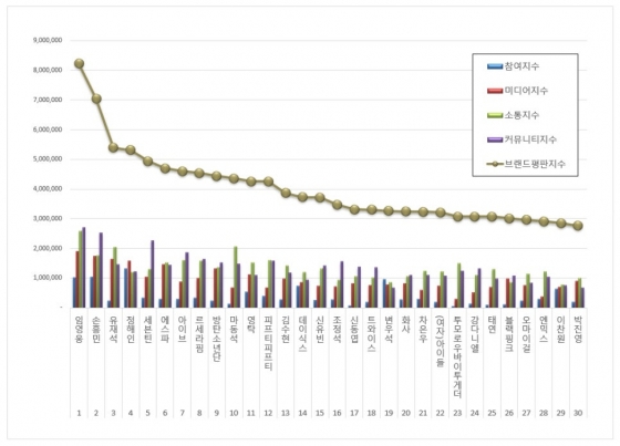 스타 브랜드평판 1위를 기록한 임영웅 브랜드는 참여지수 1,025,788 미디어지수 1,899,564 소통지수 2,583,838 커뮤니티지수 2,713,243이 되면서 브랜드평판지수 8,222,432로 분석됐다. 지난 8월 브랜드평판지수 7,718,356과 비교해보면 6.53% 상승했다.