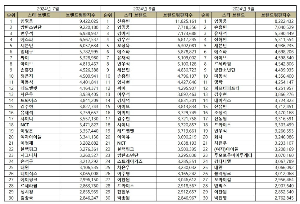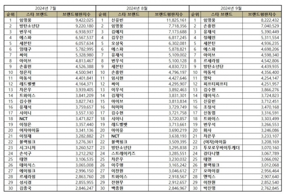 2024년 9월 스타 브랜드평판 30위 순위는 임영웅, 손흥민, 유재석, 정해인, 세븐틴, 에스파, 아이브, 르세라핌, 방탄소년단, 마동석, 영탁, 피프티피프티, 김수현, 데이식스, 신유빈, 조정석, 신동엽, 트와이스, 변우석, 화사, 차은우, (여자)아이들, 투모로우바이투게더, 강다니엘, 태연, 블랙핑크, 오마이걸, 엔믹스, 이찬원, 박진영 순으로 분석됐다.