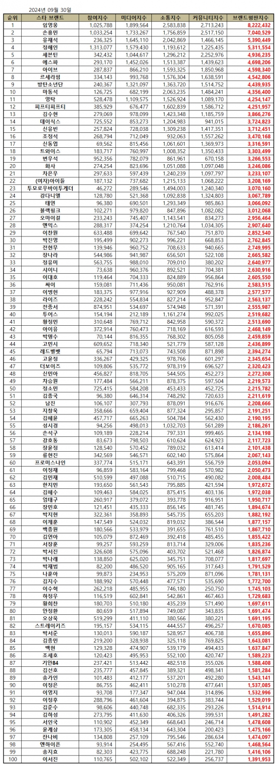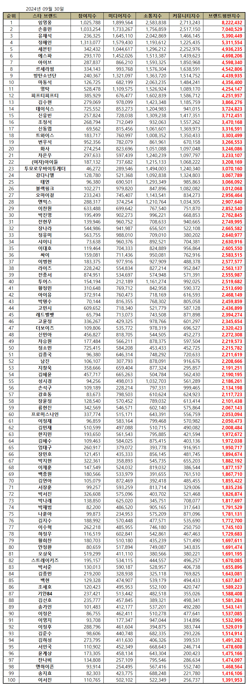 스타 브랜드평판 2024년 9월 빅데이터 분석 100위는 임영웅, 손흥민, 유재석, 정해인, 세븐틴, 에스파, 아이브, 르세라핌, 방탄소년단, 마동석, 영탁, 피프티피프티, 김수현, 데이식스, 신유빈, 조정석, 신동엽, 트와이스, 변우석, 화사, 차은우, (여자)아이들, 투모로우바이투게더, 강다니엘, 태연, 블랙핑크, 오마이걸, 엔믹스, 이찬원, 박진영, 전현무, 장나라, 정유미, 샤이니, 이대호, 싸이, 이병헌, 라이즈, 전종서, 투어스, 황정민, 아이유, 박명수, 고민시, 레드벨벳, 고윤정, 더보이즈, 신민아, 차승원, 정소민, 김종국, 남진, 지창욱, 김혜윤, 성시경, 손석구, 강호동, 장윤정, 류현진, 프로미스나인, 이정재, 김민재, 한지민, 김혜수, 엄태구, 장민호, 박지현, 이제훈, 백종원, 김연아, 서장훈, 박서진, 박나래, 박재범, 나훈아, 김지수, 이수혁, 하정우, 황희찬, 안정환, 오상욱, 스트레이키즈, 박서준, 김종민, 백현, 조세호, 기안84, 김선호, 송가인, 이정은, 이영지, 이정후, 김준수, 김하성, 서인국, 윤계상, 잔나비, 엔하이픈, 송지효, 이서진 순으로 분석됐다.