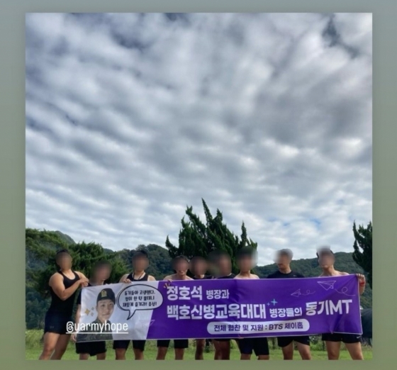 29일 SNS와 커뮤니티에는 9명의 병사가 현수막을 들고 있는 사진이 공개됐다. 사진 속 현수막에는 "정호석 병장과 백호 신병교육대대 병장들의 동기 MT. 전체 협찬 및 지원 : BTS 제이홉"이라는 글이 적혀 있다.