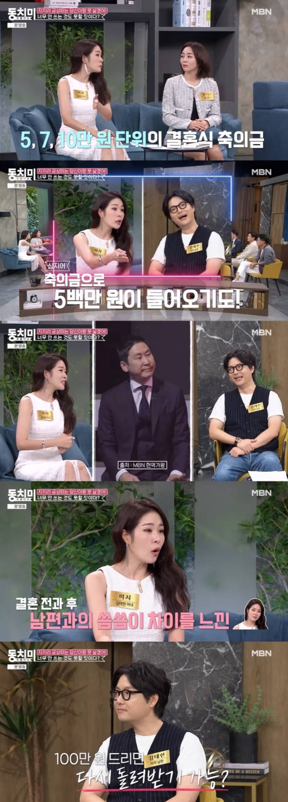지난 28일 방송된 MBN '속풀이쇼 동치미'(이하 '동치미')에서는 미자, 김태현 부부가 서로 다른 돈 씀씀이에 대해 얘기했다.
