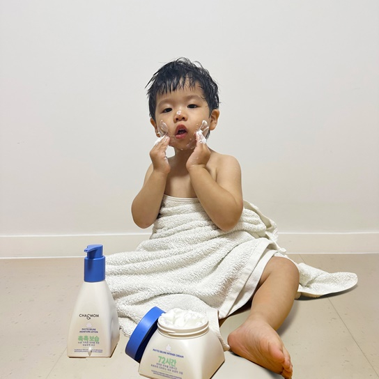 공개 된 사진 속 준범은 얼굴에 로션을 바르고 해맑게 웃고 있다. 갓 목욕을 하고 나온 듯한 모습이 너무나 사랑스럽다.