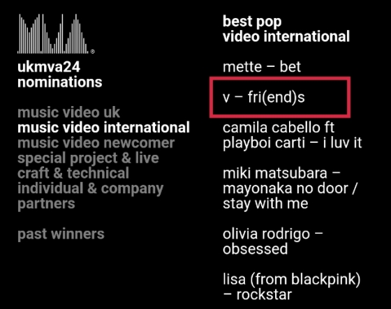 뷔가 지난 3월 15일 발표한 디지털 싱글 '프렌즈' 뮤직비디오가 '영국 뮤직비디오 어워드(UKMVA) 2024'에서 '베스트 팝 인터내셔널'(Best Pop International) 부문 후보에 올랐다.