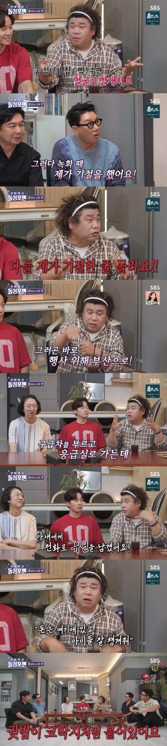 이어 오정태는 "바로 행사가려고 부산에 갔다. 머리가 좀 아팠다. 바닥이 움직이는 거다. '이거 뇌진탕이다. 나 지금 죽을 것 같다'라고 했더니 관계자들이 난리가 났다. 구급차를 부르고 응급실에 갔다. '돈은 여기에 있고 아이들 잘 챙겨라'라며 아내에게 전화로 유언도 했다"라며 긴박했던 당시 상황을 전했다.