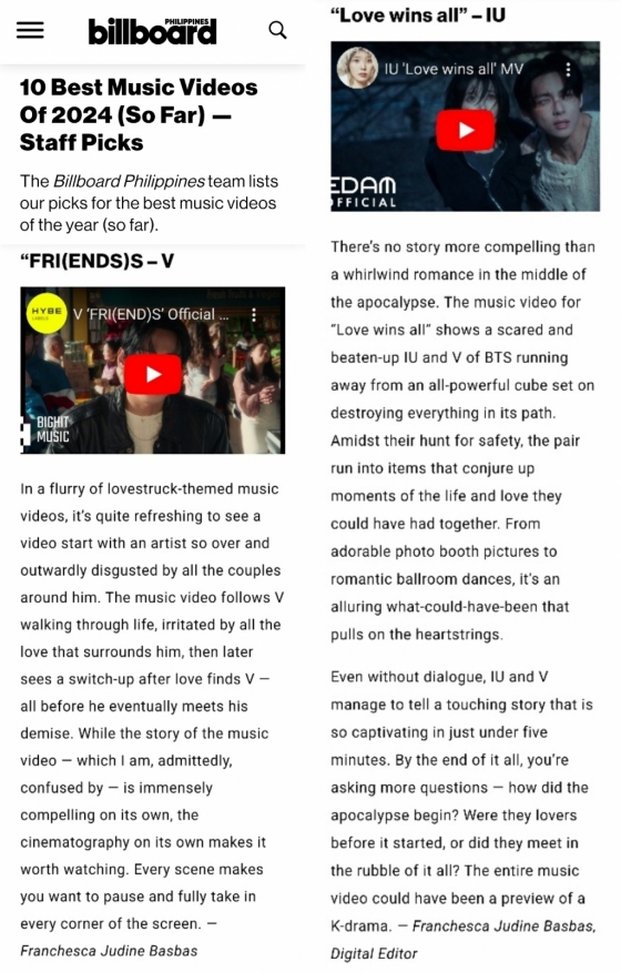 베스트 뮤직비디오 10선에는 뷔의 '프렌즈' 뮤직비디오와 뷔가 출연해 인상적인 연기를 펼친 아이유의 '러브 윈즈 올'(Love Wins All)을 비롯해 사브리나 카펜터의 'Please, Please, Please', 아리아나 그란데의 'We Can't Be Friends' 등 글로벌 팝 스타들의 뮤직비디오가 포함됐다.