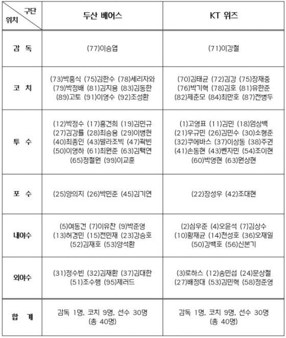 결국 두산은 투수 14명으로 데려가면서 아쉬운 선발진의 단점을 보완하는 쪽을 선택했다. 곽빈 외에 발라조빅, 최승용, 최원준 등 선발 투수로 뛸 수 있는 자원은 충분하지만, 아무래도 쿠에바스-벤자민이 나설 KT에 비해 무게감이 떨어지는 것이 사실이다. 이밖에 두산은 포수 3명, 내야수 8명, 외야수 5명 등 총 30명으로 엔트리를 꾸렸다.
