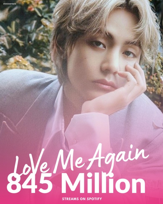 방탄소년단(BTS) 뷔의 '러브 미 어게인'(Love Me Again)이 스포티파이(Spotify)에서 8억 4500만 스트리밍을 돌파하며 인기를 빛냈다.