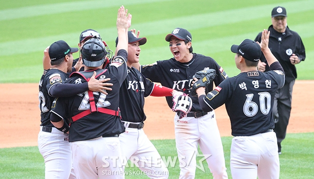 경기가 끝난 뒤 '승장' 이강철 감독은 "팀이 신기하게 이름을 잘 지은 것 같다"며 환하게 웃은 뒤 "최초 기록을 세우게 됐다. 그런데 사실 제가 아침에 말씀을 못 드린 부분이 있는데, (지난달 24일) 롯데전부터 경기 과정을 보면 이길 경기가 아닌데, 계속 승리했다. 그러면서 뭔가 만들어지는 느낌이 좀 들었다"고 입을 열었다.
