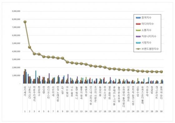 5위, '런닝맨' 브랜드는 참여지수 512,604 미디어지수 846,574 소통지수 789,358 커뮤니티지수 836,550 시청지수 395,418이 되면서 브랜드평판지수 3,380,502로 분석됐다. 지난 9월 브랜드평판지수 4,175,420과 비교해보면 19.04% 하락했다.