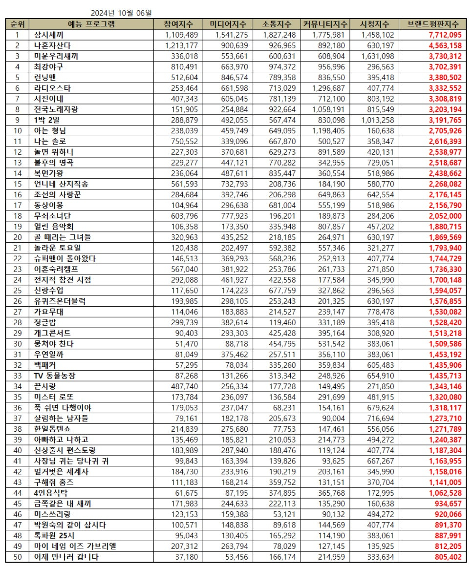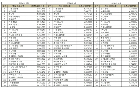 이번 2024년 10월 예능 프로그램 브랜드평판 조사에서는 삼시세끼, 나혼자산다, 미운우리새끼, 최강야구, 런닝맨, 라디오스타, 서진이네, 전국노래자랑, 1박 2일, 아는 형님, 나는 솔로, 놀면 뭐하니, 불후의 명곡, 복면가왕, 언니네 산지직송, 조선의 사랑꾼, 동상이몽, 무쇠소녀단, 열린 음악회, 골 때리는 그녀들, 놀라운 토요일, 슈퍼맨이 돌아왔다, 이혼숙려캠프, 전지적 참견 시점, 신랑수업, 유퀴즈온더블럭, 가요무대, 정글밥, 개그콘서트, 뭉쳐야 찬다, 우연일까, 백패커, TV 동물농장, 끝사랑, 미스터 로또, 푹 쉬면 다행이야, 살림하는 남자들, 한일톱텐쇼, 아빠하고 나하고, 신상출시 편스토랑, 사장님 귀는 당나귀 귀, 벌거벗은 세계사, 구해줘 홈즈, 4인용식탁, 금쪽같은 내 새끼, 미스쓰리랑, 박원숙의 같이 삽시다, 톡파원 25시, 마이 네임 이즈 가브리엘, 이제 만나러 갑니다 에 대한 브랜드 빅데이터 분석으로 이뤄졌다.