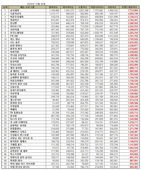 한국기업평판연구소는 2024년 9월 6일부터 2024년 10월 6일까지 국민들에게 사랑받는 예능 프로그램 50개의 브랜드 빅데이터 100,630,637개를 분석하여 소비자들의 브랜드 참여와 소통량, 미디어소비, 브랜드 확산량, 소비량을 측정했다. 지난 9월 예능 프로그램 브랜드 빅데이터 89,637,386개와 비교하면 12.26% 증가했다.
