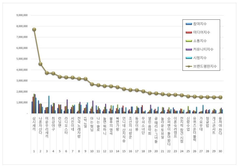 3위, '미운우리새끼' 브랜드는 참여지수 336,018 미디어지수 553,661 소통지수 600,631 커뮤니티지수 608,904 시청지수 1,631,098이 되면서 브랜드평판지수 3,730,312로 분석됐다. 지난 9월 브랜드평판지수 4,030,143과 비교해보면 7.44% 하락했다.