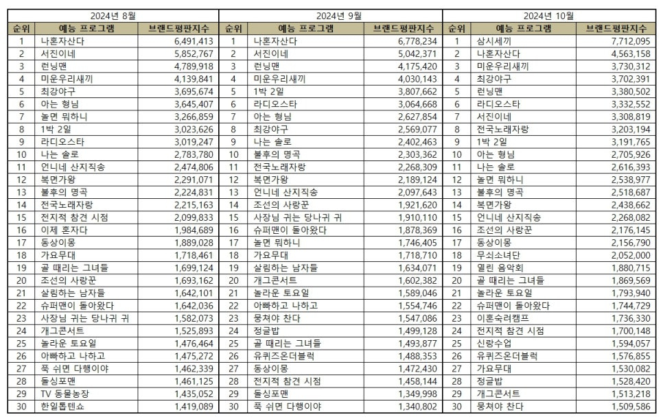 2024년 10월 예능 프로그램 브랜드평판 30위 순위는 삼시세끼, 나혼자산다, 미운우리새끼, 최강야구, 런닝맨, 라디오스타, 서진이네, 전국노래자랑, 1박 2일, 아는 형님, 나는 솔로, 놀면 뭐하니, 불후의 명곡, 복면가왕, 언니네 산지직송, 조선의 사랑꾼, 동상이몽, 무쇠소녀단, 열린 음악회, 골 때리는 그녀들, 놀라운 토요일, 슈퍼맨이 돌아왔다, 이혼숙려캠프, 전지적 참견 시점, 신랑수업, 유퀴즈온더블럭, 가요무대, 정글밥, 개그콘서트, 뭉쳐야 찬다 순으로 분석됐다.