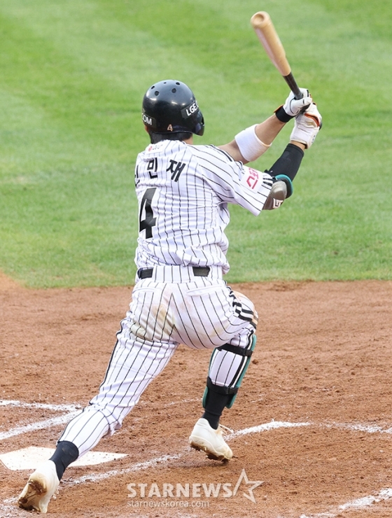 전날 패전에도 신민재는 3타수 2안타 1볼넷 2도루로 LG에서 유일하게 홀로 멀티히트를 기록하며 펄펄 날았던 선수였다. 그 타격감이 이날도 이어졌다. 1회 첫 타석 초구 땅볼로 물러난 신민재는 LG가 1-2로 지고 있는 3회 말 1사 1, 3루에서 엄상백의 슬라이더를 공략해 좌전 1타점 적시타로 2-2 동점을 만들었다. 뒤이어 2루까지 훔쳤으나, 후속타 불발로 홈은 밟지 못했다.