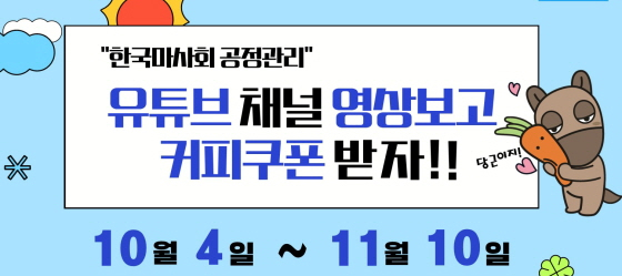 참여방법은 오는 11월 10일까지 한국마사회 공정관리 유튜브 채널에서 공정경마 교육영상 4편을 시청한 후 '좋아요'를 누르고 댓글을 작성하면 된다. 참여자 중 추첨을 통해 300명에게 기프티콘을 제공하는 등 경품도 마련되어 있다.