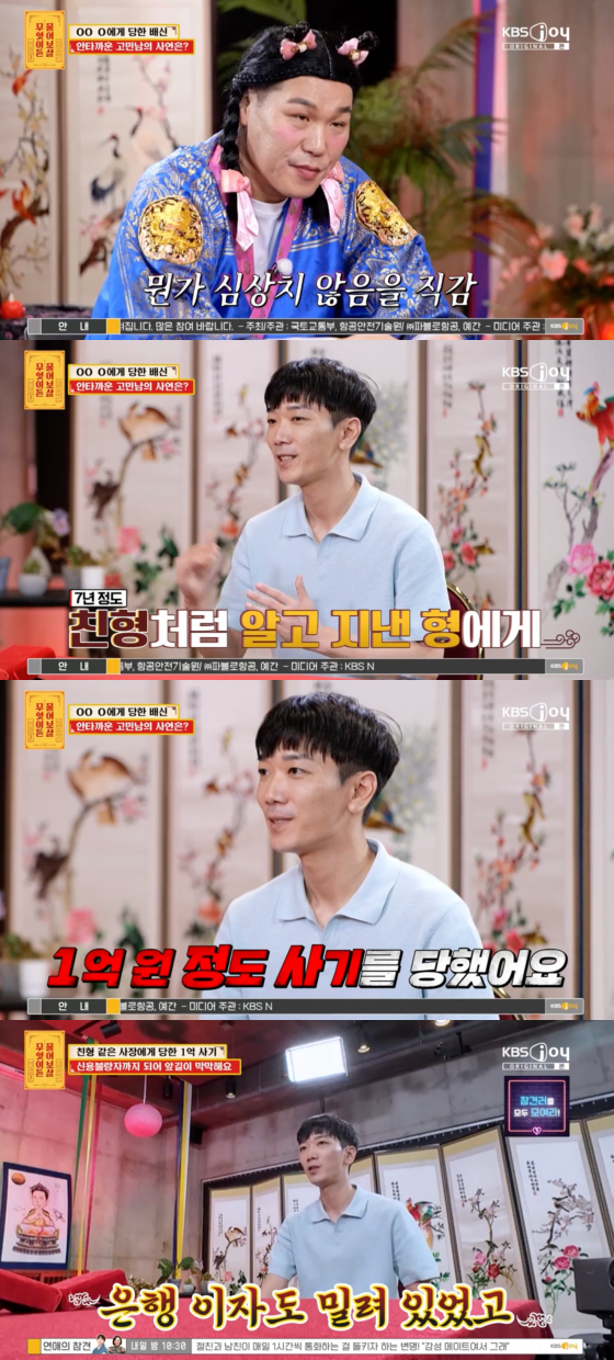 7일 방송된 KBS Joy 예능 프로그램 '무엇이든 물어보살'에는 7년 정도 친형처럼 알고 지낸 형에게 1억 원 정도 사기를 당했다는 35세 사연자가 출연했다.