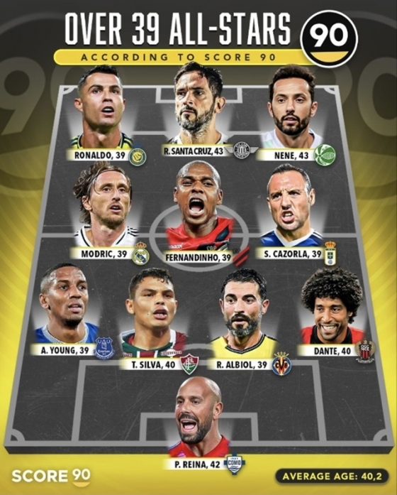또 '43살 동갑' 네네(주벤투지), 리버풀 수문장이었던 호세 페페 레이나(40·코모)도 이름을 올렸다. 브라질 대표팀 핵심 센터백이었던 티아구 실바(40·플루미넨시), 바이에른 뮌헨 출신 수비수 단테(40·니스)도 함께 했다.