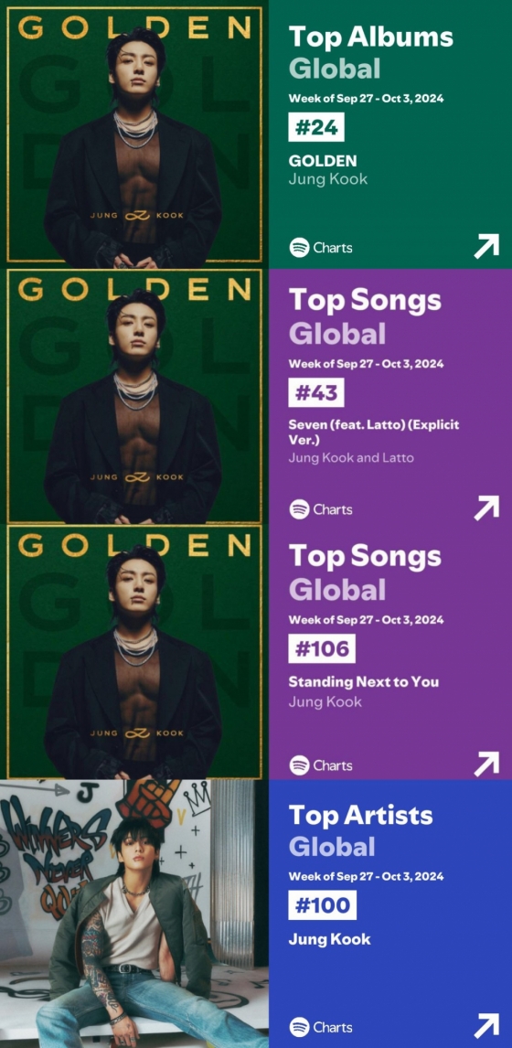 스포티파이가 발표한 최신 차트(9월 27일~10월 3일)에 따르면, 지난해 11월 발매한 정국의 첫 솔로 앨범 'GOLDEN'은 '위클리(주간) 톱 앨범 글로벌'에서 24위를 차지했다.