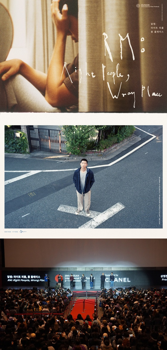 7일 오후 8시 부산 해운대구 영화의전당 야외극장에선 방탄소년단 RM의 첫 다큐멘터리 영화 '알엠: 라이트 피플, 롱 플레이스'(RM: Right People, Wrong Place)의 월드 프리미어 상영회가 진행됐다. K-팝 다큐멘터리 최초로 제29회 부산국제영화제(이하 'BIFF') 오픈 시네마 부문에 공식 초청되며 성대하게 첫선을 보인 것. 'BIFF'는 이 작품에 대해 "앨범 메이킹 필름이면서 아주 특별한 청춘의 일지"라는 평을 남겼다.