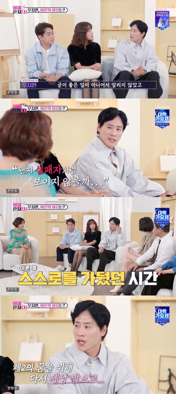 우지원은 두 딸을 떠올리며 눈물을 쏟았다. 그는 "아이들에게 미안하다. 부모로서 자꾸 다투는 모습을 보일 때마다 아이들에게 너무 너무 미안했다. 어떻게든 다시 잘 살아보려고 했으나 안 되는 건 안 되더라. 이혼했다는 게 왠지 실패자인 것 같고 움츠러들더라. 생각보다 되게 어려웠다. 죄인은 아니지만 덜컥 겁이 났다. 가장 중요한 건 아이들이 어리다는 거였다"고 털어놨다.