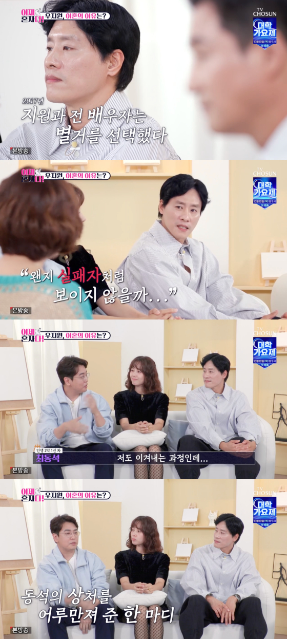 우지원의 이야기를 듣던 최동석은 "나도 이겨내는 과정"이라며 "'이혼이 실패자가 된 기분'이라는 말이 가슴에 와 닿았다. 나도 이혼 초반에는 그랬던 것 같다. 그래서 공감이 된다"고 속마음을 드러냈다.